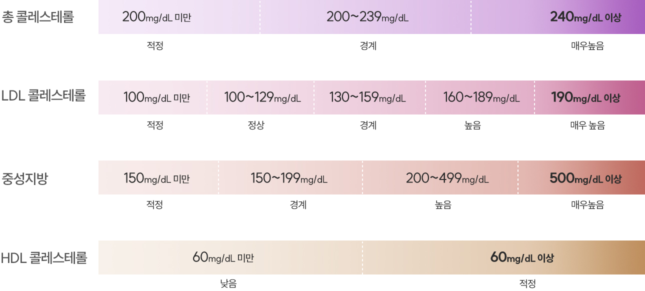 이 3가지를 합쳐 총콜레스테롤이라고 하며 이들 중 하나라도 기준치보다 높거나 낮으면 이상지질혈증이라고 합니다.