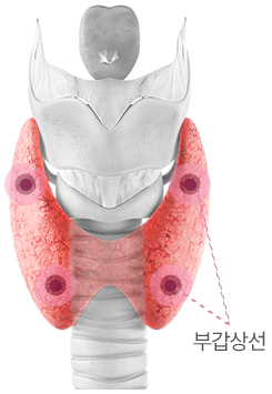 갑상선 뒤쪽에 상하좌우로 총 4개의 부갑상선이 존재합니다. 부갑상선은 칼슘 조절에 중요한 역할을 하는 호르몬을 분비합니다.